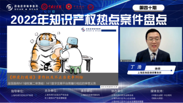 丁浩盤(pán)點(diǎn)并解讀了2022年著作權(quán)及商標(biāo)熱點(diǎn)案例,重點(diǎn)介紹了全國(guó)首例NFT侵權(quán)案:《胖虎打疫苗》著作權(quán)及不正當(dāng)競(jìng)爭(zhēng)糾紛、嗶哩嗶哩商標(biāo)無(wú)效行政訴訟、范斯公司(VANS,INC.)與高志龍等侵害商標(biāo)權(quán)糾紛案和搬酒網(wǎng)不正當(dāng)競(jìng)爭(zhēng)糾紛案。
